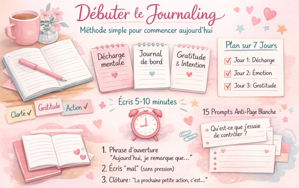 Bonne nouvelle : tu n’as pas besoin d’être “inspiré(e)”, d’avoir une vie incroyable, ni d’écrire des pages entières. Tu as juste besoin d’une méthode simple, répétable, et assez légère pour démarrer… aujourd’hui.